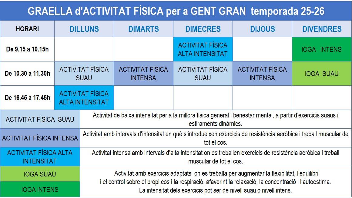 IOGA SUAU o INTENS: Activitat amb exercicis adaptats on es treballa per augmentar la flexibilitat, l’equilibri i el control sobre el propi cos, connectant el cos, la respiració i la ment, afavorint la relaxació, la concentració i l’autoestima. La intensitat dels exercicis pot ser de nivell suau o nivell intens.